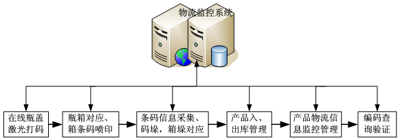 利 用整箱賦碼技術(shù)在每一瓶啤酒的瓶蓋上打印一組身份信息數(shù)碼、每個紙箱指定位置噴印相應(yīng)的條形碼信息,實現(xiàn)單瓶與成品箱的對應(yīng)賦碼。碼垛時,將箱和托盤組成 對應(yīng)關(guān)聯(lián)。系統(tǒng)通過對生產(chǎn)、入庫、倉庫管理、出庫發(fā)貨、報損、盤點等環(huán)節(jié)的追溯管理,可對每一瓶酒的相關(guān)信息進行精確的信息追溯。