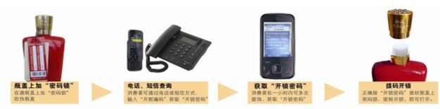 對(duì)高檔白酒類產(chǎn)品,采用“密碼鎖防偽瓶蓋”進(jìn)行防偽,在不影響其現(xiàn)有生產(chǎn)工藝流程前提下,只需在其產(chǎn)品入庫(kù)前將帶有防偽吊牌的“密碼鎖防偽瓶蓋”扣裝在其原有瓶蓋上即可。此時(shí),“密碼鎖防偽瓶蓋”即與原有瓶蓋鎖定為一體、無法開啟;只有通過防偽吊牌上提供的查詢方法獲取“開鎖密碼”后,才能開啟。消費(fèi)者在購(gòu)買帶有“密碼鎖防偽瓶蓋”的高檔白酒產(chǎn)品后,通過防偽吊牌上提供的查詢方法,撥打固定電話或發(fā)送短信,系統(tǒng)將告知被查詢產(chǎn)品真?zhèn)巍?ldquo;開鎖密碼”。