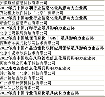 ?????? 大會同時揭曉了2012中國行業(yè)信息化評選活動獲獎榜單,思科、東軟、星網(wǎng)視易、星網(wǎng)銳捷等200余家行業(yè)信息化標(biāo)桿企業(yè)分別在本次活動中榮獲企業(yè)類、產(chǎn)品類等獎項。其中華美龍公司在此次評選活動中榮獲:“2012年度中國產(chǎn)品追溯物聯(lián)網(wǎng)應(yīng)用領(lǐng)域最具影響力企業(yè)獎”。