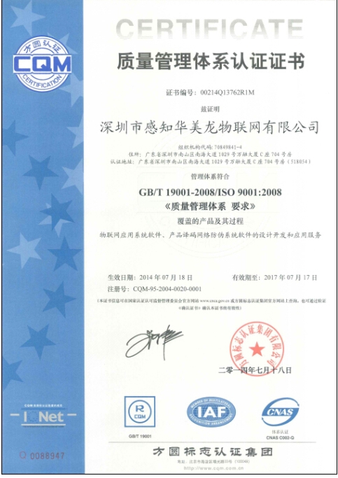 (本網(wǎng)訊 記者 張小燕)深圳市感知華美龍物聯(lián)網(wǎng)有限公司成立15年來始終嚴把質(zhì)量關(guān)和安全關(guān),于近日第五次通過了方圓標志認證集團有限公司ISO9001-2008質(zhì)量體系認證,并根據(jù)“安全、創(chuàng)新、服務(wù)、合作、發(fā)展”的質(zhì)量方針,把貫徹標準作為全面提升企業(yè)質(zhì)量治理水平的最佳途徑,強化質(zhì)量意識,建立了有效的質(zhì)量保證體系,取得了顯著的質(zhì)量成效。